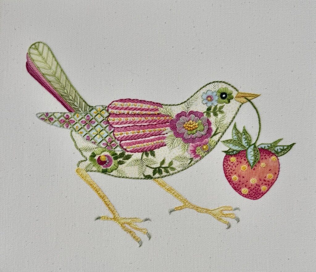 William Morris’s iconic ‘Strawberry Thief’ thrush has been re-imagined in a beautiful springtime colour palette and worked in a range of surface stitch techniques. The project includes buttonhole stitch and variations, knots and various loop stitches ornamented with whipping and seeding stitches. Over-dyed DMC stranded cottons and C21st Yarns are worked on a cotton ground with additional beads, sequins and metallic threads for a shimmering effect.