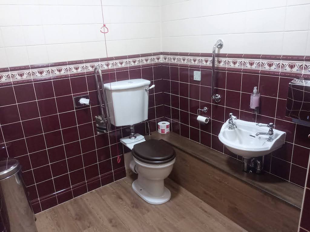 We have attempted to adhere to DocM specifications and guidelines (those set the specs for what is needed so a facility may be used effectively by a person in a wheelchair), with the correct height of toilet pan, sink and with easily operable lever taps and flush handle.