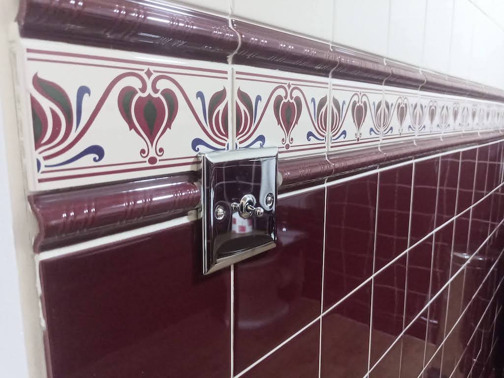 We have been meticulous in our attention to detail. Minton tiles in burgundy and cream, decorative dado level border, non slip oak wood effect flooring, chrome piping, accessories to match.