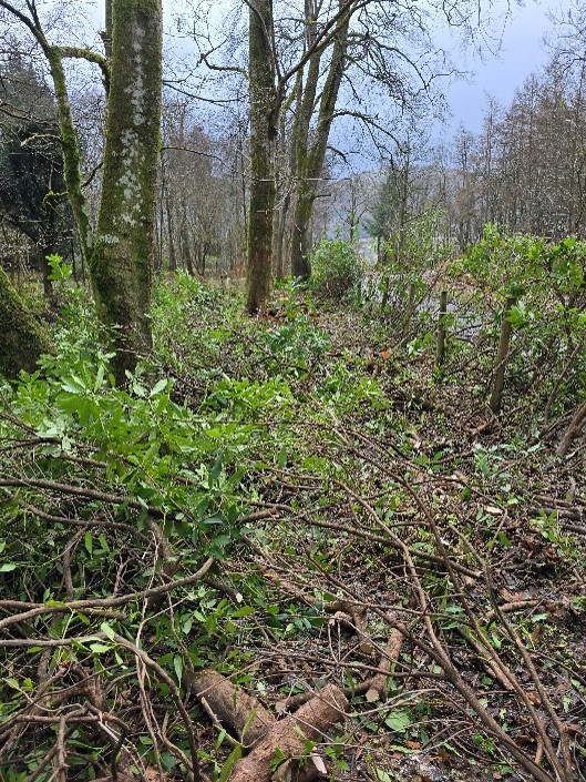 As part of the garden management plan, our garden team have been busy with the arduous task of removing Rhododendron ponticum from the site over winter. This is a multi-phase process that requires cutting the whole shrub to ground level. The brash is burned as a precaution to guard against the risk of spreading Phytophthora ramorum. Seedlings and recently layered plants will be grubbed from the ground, but mature thickets will require stem treatments to prevent future regrowth.