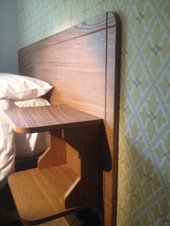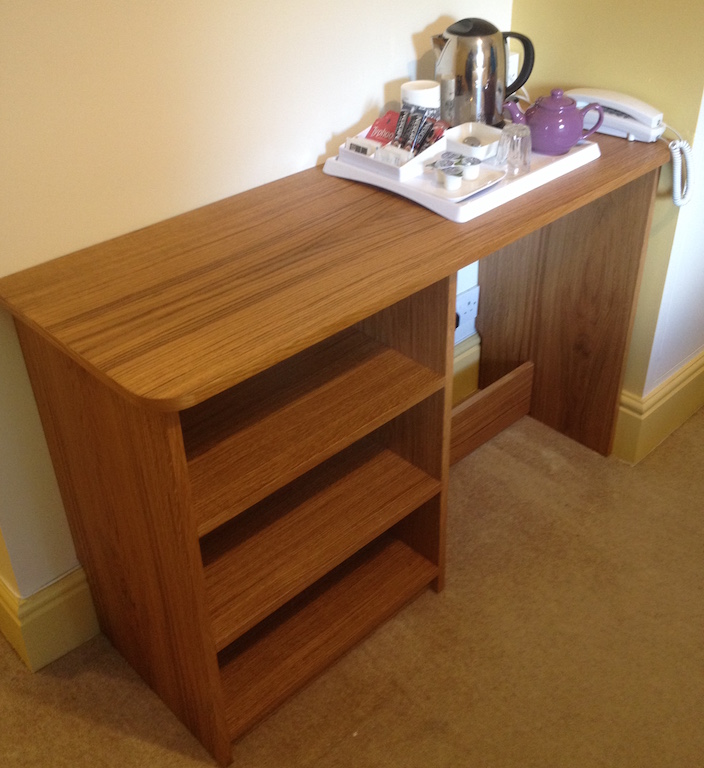 The most recent change has been the light oak headboards with integral side table, and shelving/desk/dressing table unit by our carpenter Simon. He has integrated a subtle rounded edge and a routed groove that creates a cross in the corner of the headboard, with neat shelving merging the traditional with the modern, without loosing the feel of the neo-gothic we were wanting to reflect. On a practical note, like the hotel chains, we have opted to go “drawer-less” and have open shelving, so there should be less chance of things being left behind! A coating of Danish Oil is all the oak veneer requires from time to time.