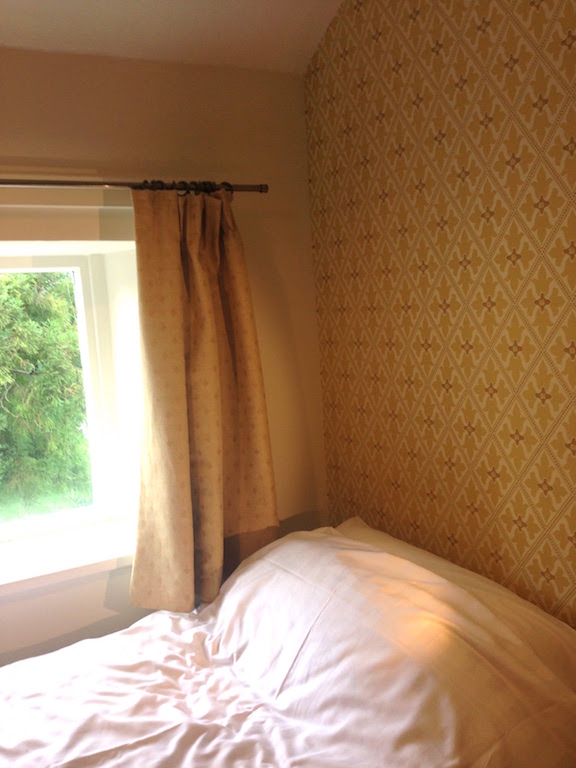 Room 4 now has its new curtains up – a light gold version of the gothic harvest theme in rooms 1 & 2. We are waiting for Room 5’s material. The curtain rails are bronze metal poles with rings. Room 5 is still awaiting some panelling work around its window.