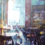 Ceri Allen studied Fine Art Painting at City & Guilds School of Art, London She has exhibited widely and is a longstanding member of the Lake Artists Society. She exhibits with The Castlegate House Gallery, Cockermouth. Her work is represented in public and private collections in the UK and USA Collections include, Tullie House, Carlisle, St Mary’s Hospital, Paddington and Corpus Christi College, Oxford. She has been selected for Artist Residencies at the University of Cumbria, Corpus Christi College, Oxford, Kronstadt, St Petersburg with the NCCA, Demi-paradise production, Lancaster Castle and with Hypha Studio’s in Penrith Commissions include a painting for the historic ‘Oxford Almanack’ (2017 edition), several works for Corpus Christi College, a portrait of novelist Margaret Forster and Lord Inglewood’s MEP rally including Lord and Lady Whitelaw. She was shortlisted for inclusion in the New Lights Art Prize Exhibition 2020 and 2023. ‘I am a figurative painter and work primarily in oil on canvas. Currently my main interest is in representing people in an urban environment’. My paintings are composed of elements from memory, sketches and/or photographs. The composition is important – the division of pictorial space and the way this can be used to convey certain moods. I am drawn to the effect of light on surface and repeat patterns and shapes’.